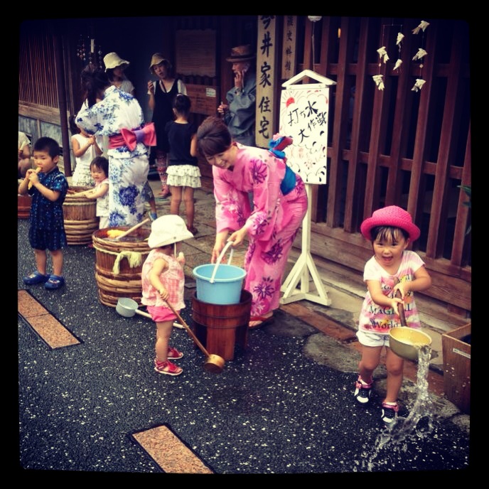 子供達が打ち水をしとる写真。