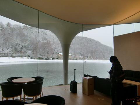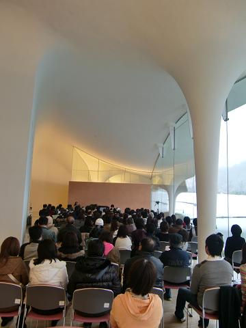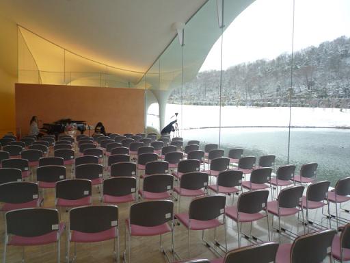 会場には、ピアノ、そしてみんなを待ち構えるたくさんの椅子、すぐ横はすべて大きな窓になっとって、外は雪山と湖です。