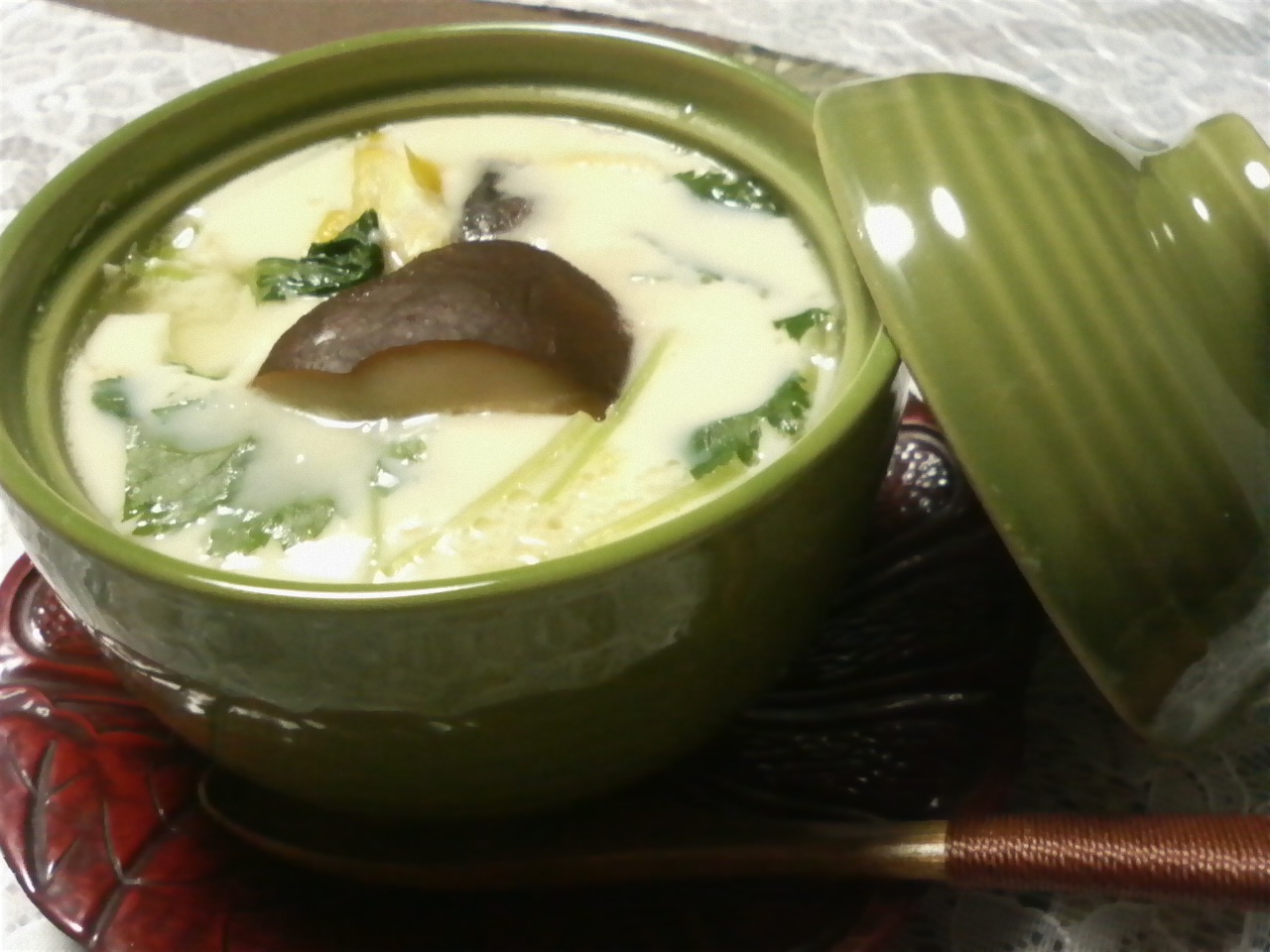肉じゃがの下の写真は、この間、実家でお母さんに作ってもらった茶碗蒸しです
