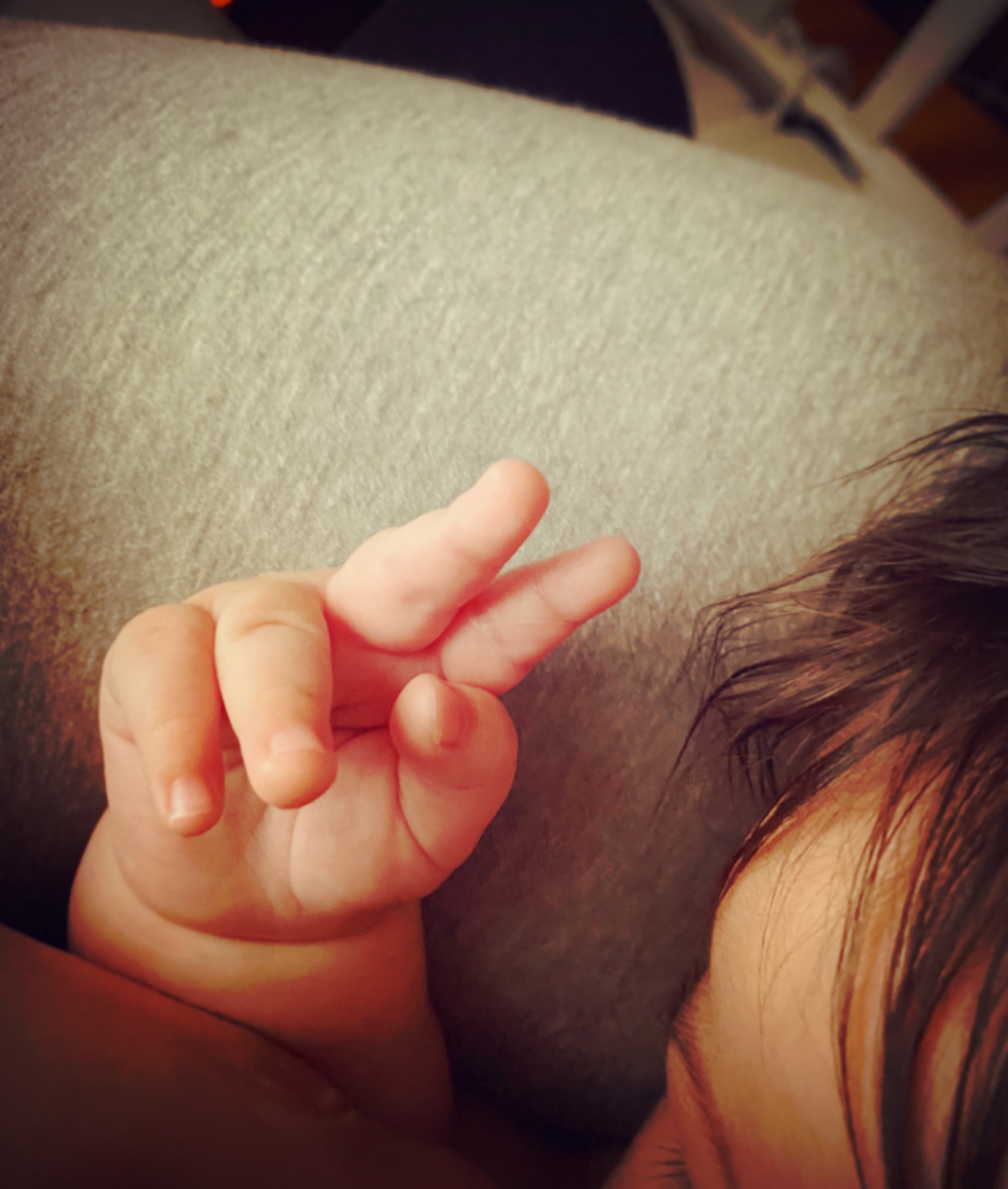 お昼寝の時、よくピースします。
